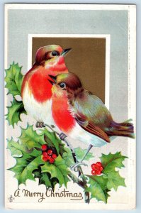 Christmas Postcard Bird And Holly Berries Embossed Dorset Vermont VT c1910's