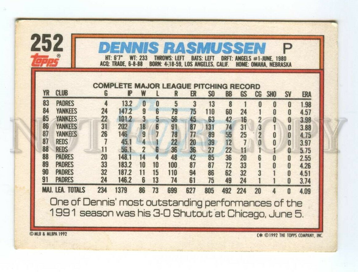 Baseball topps card 1992 dennis rasmussen padres #252 Description: >>> Age: Original Informative card 1992 year >>> Approx.Size: 3.4X2.4 inches (9X6.4 cm) >>> Publisher: Topps Company Inc >>> Series# > ... Read More