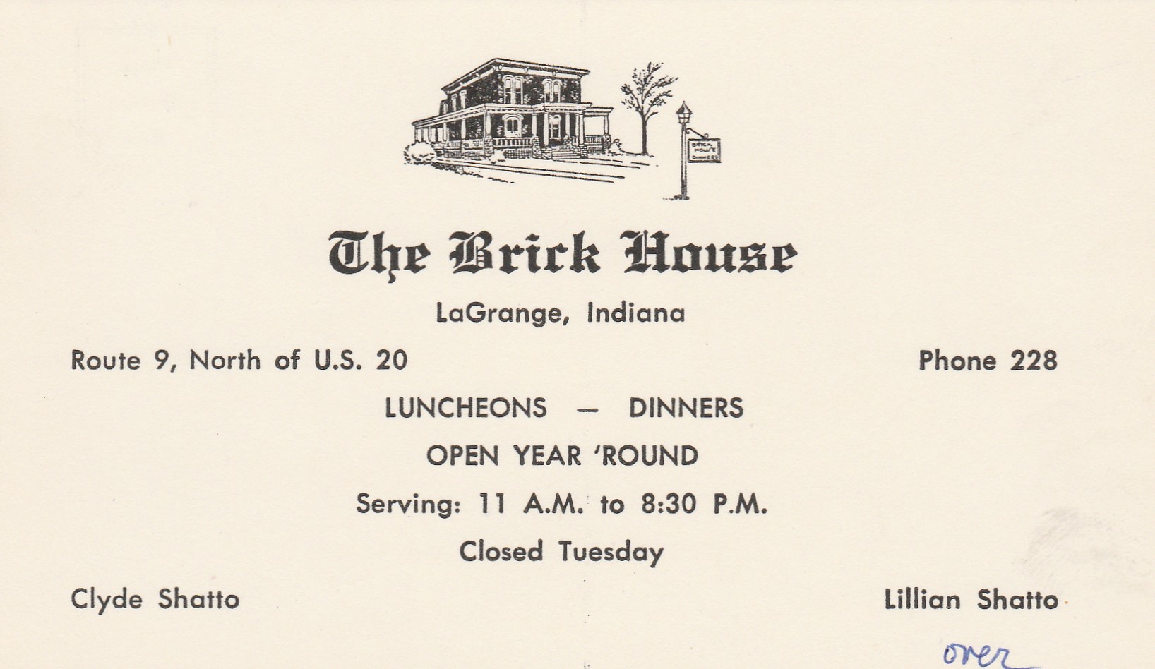 The Brick House, LaGrange, Indiana, Route 9, North of U.S. 20 Say hello to the Shattos Hand Note: 1956