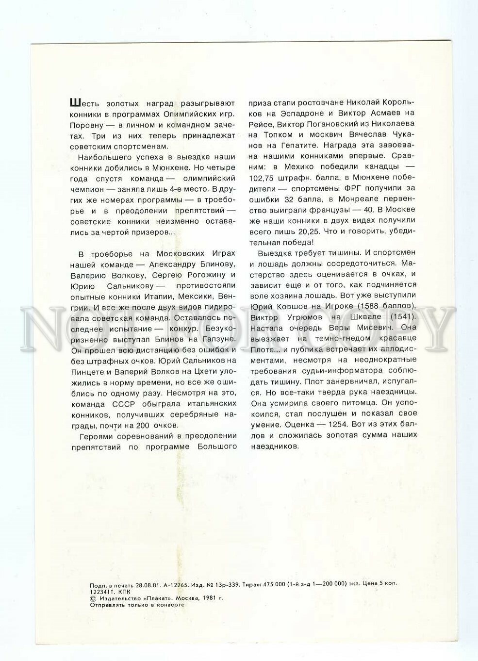 1980 olympic ussr soviet national team equestrian old Description: >>> Age: Original old Poster informational Card 1981 year >>> Approx.Size: 5.8X8.3 inches (14.8X21 cm) >>> Publisher: Plakat (Poster), Ru ... Read More
