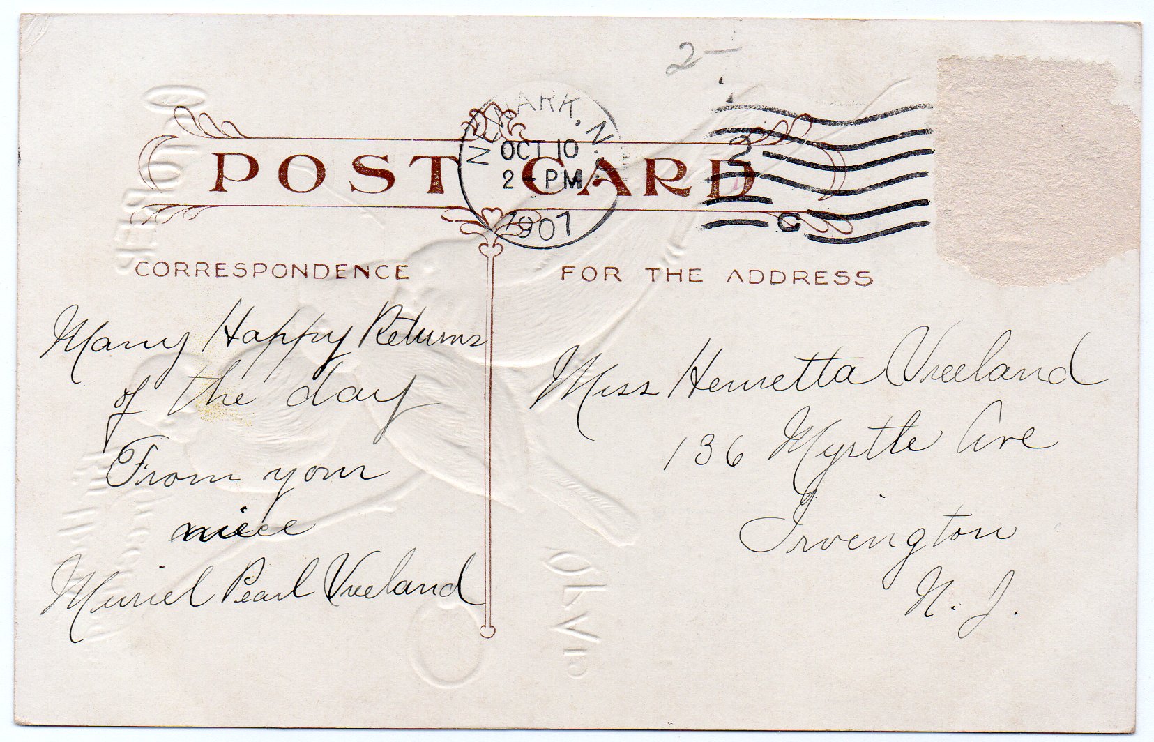 Posted from Newark NJ, October 10, 1907