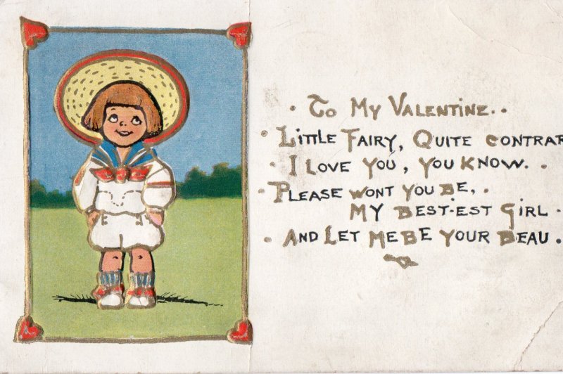 To My Valentine, Little Fairy, Quite Contrary, I Love You, You Know, Please Won't You Be, My Best-est Girl, And Let Me Be Your Beau.Bent corners, slight vertical bend on embossed line, Posted from Philadelphia on February 14, 1911.