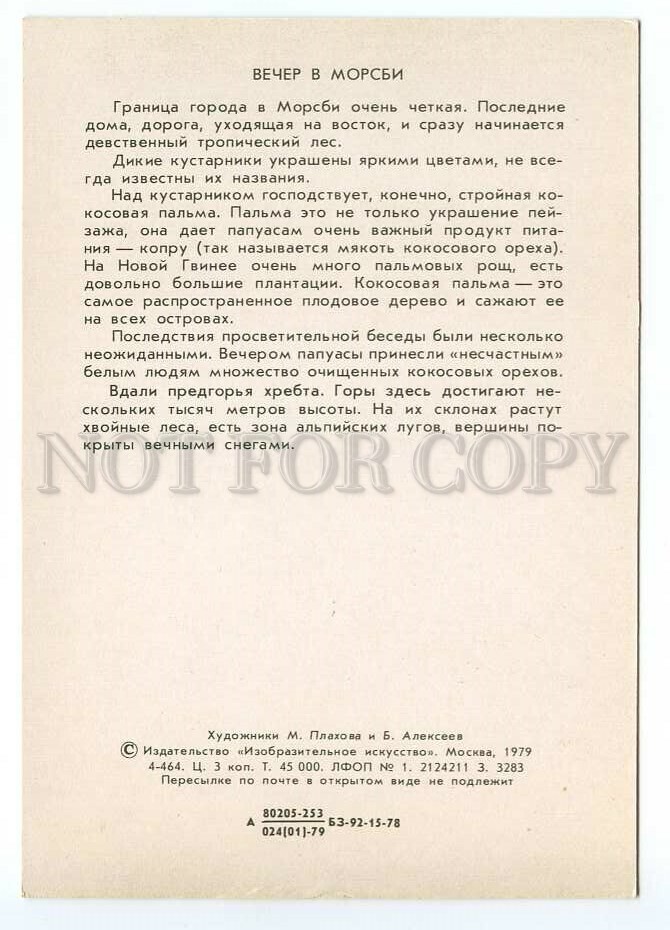 Oceania papua new guinea moresby town evening plakhova Description: >>> Age: Original old postcard 1979 year >>> Approx.Size: 6X4 inches (15X10 cm) >>> Publisher: Izobrazitelnoye Iskusstvo - USSR Russia > ... Read More