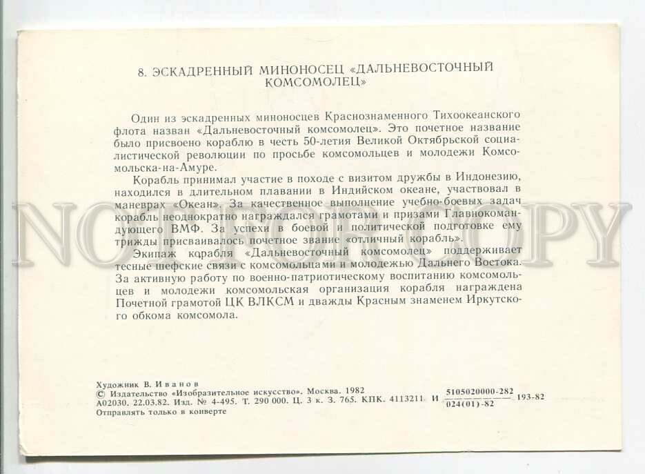 Ussr destroyer far eastern komsomolets old postcard Description: >>> Age: Original old inform card 1982 year >>> Approx.Size: 6X4 inches (15X10 cm) >>> Publisher: Izobrazitelnoye Iskusstvo - Fine Art - US ... Read More