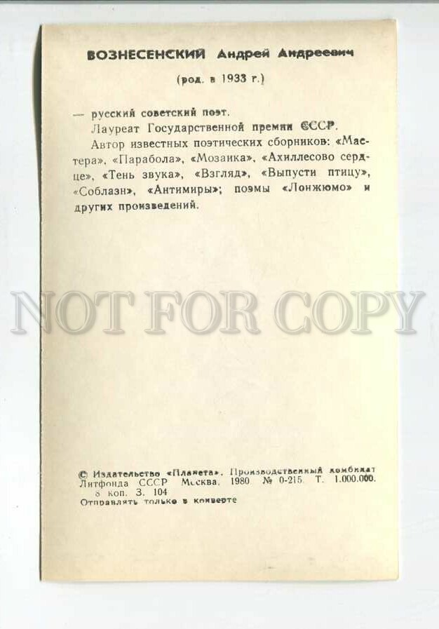 181933 Soviet poet Andrei Voznesensky old postcard