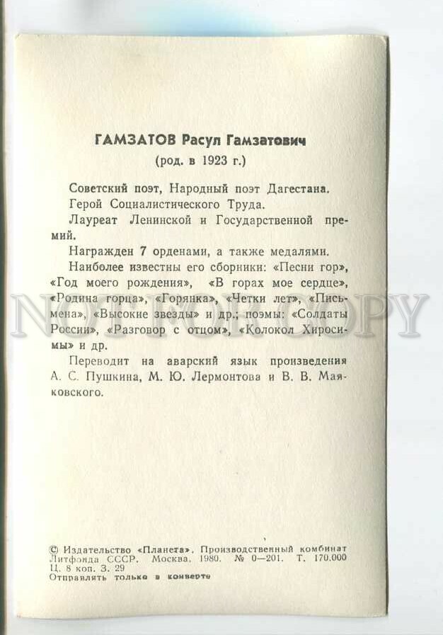 Soviet Poet Dagestan Gamzatov Rasul Old Postcard Description: >>> Age: Original old photo card 1980 year >>> Approx.Size: 5.5X3.5 inches (14X9 cm) >>> Publisher: Planeta Moscow USSR Russia >>> SERIES# S ... Read More
