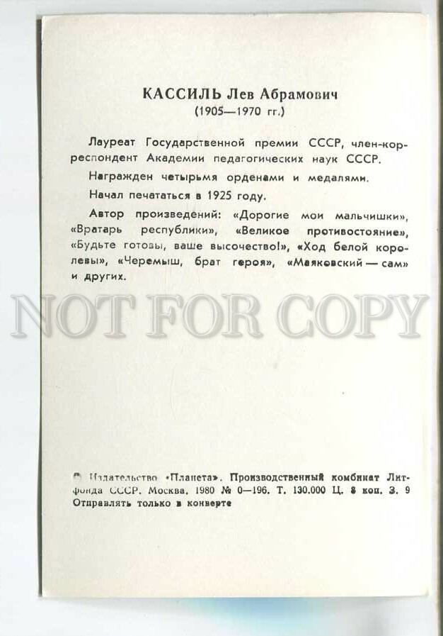 Soviet Children's Writer Leo Kassil Old Postcard Description: >>> Age: Original old photo card 1980 year >>> Approx.Size: 5.5X3.5 inches (14X9 cm) >>> Publisher: Planeta Moscow USSR Russia >>> SERIES# S ... Read More