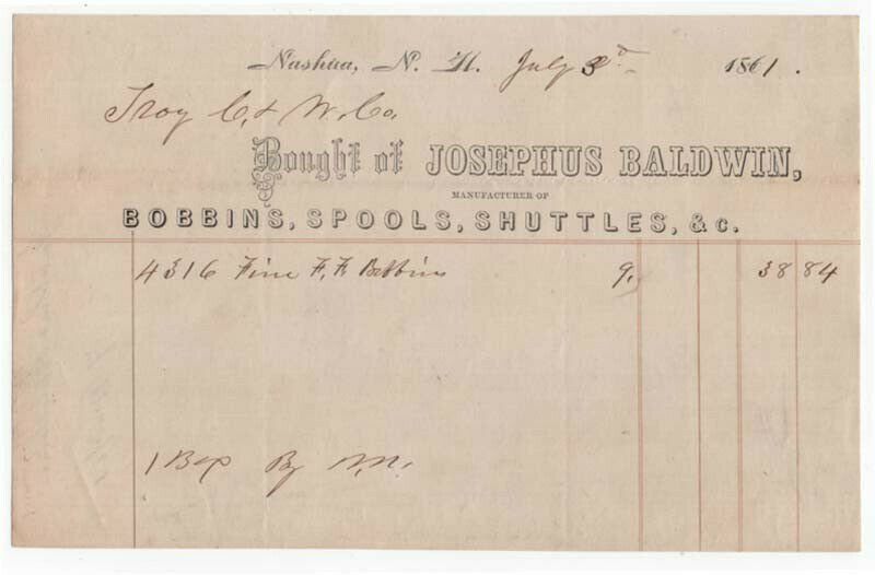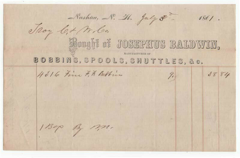 1861 Billhead, JOSEPHUS BALDWIN, Bobbins, Spools, Shuttles, Nashua, NH