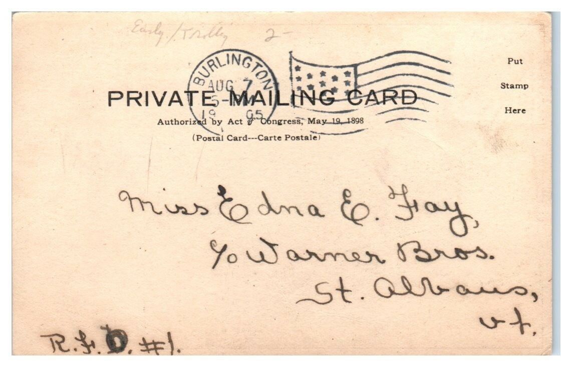 I have for sale one 1905 The Richardson, Burlington, VT Private Mailing Card Postcard.