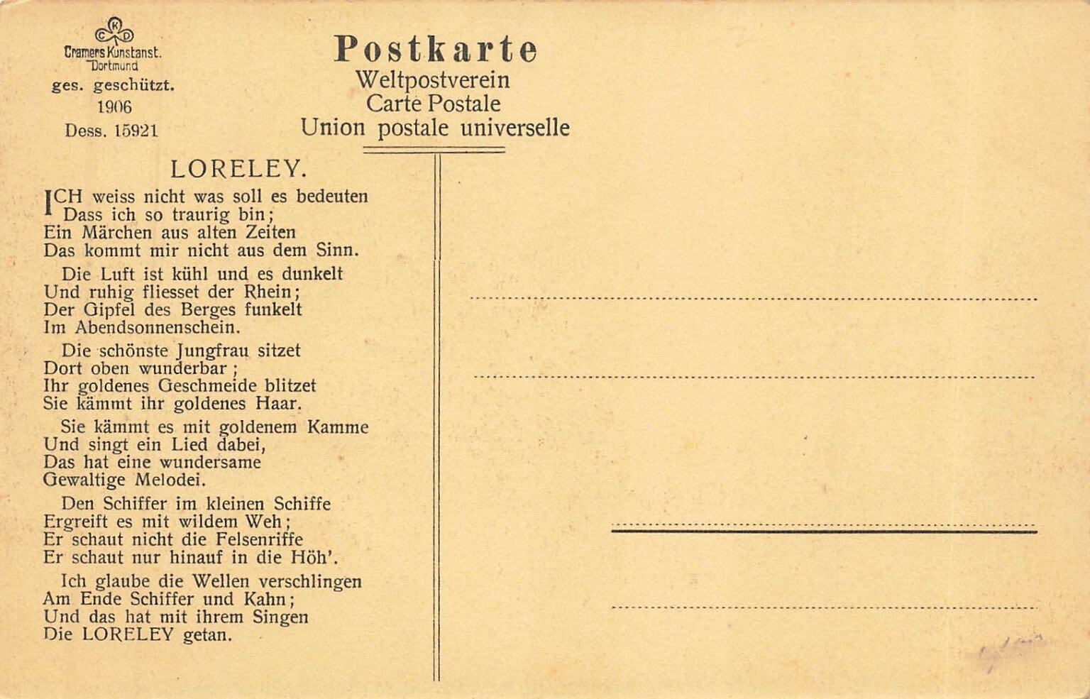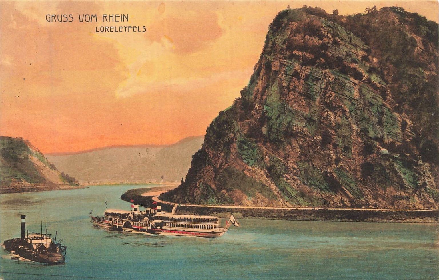 Discover a captivating piece of German history with this exquisite postcard from 1906, featuring the legendary Loreley Rock on the Rhine River. The front vividly portrays the iconic Loreleyfels towering majestically above the tranquil waters, with a grand paddle steamer and a smaller vessel navigating the historic river. The artistic rendering captures the dramatic landscape and the golden hues of what appears to be a sunrise or sunset, evoking the romanticism associated with this famous stretch of the Rhine. This beautiful card is a testament to the scenic beauty and the bustling river traffic of early 20th-century Germany.Published by Cramers Kunstanstalt of Dortmund, a renowned name in postcard production, this card is dated 1906 and includes its design number, affirming its historical authenticity. The reverse features the complete text of Heinrich Heine's iconic poem "LORELEY," adding significant cultural and literary value to the piece. This collectible postcard offers a unique glimpse into the past, perfect for enthusiasts of German topography, river navigation, or vintage ephemera.