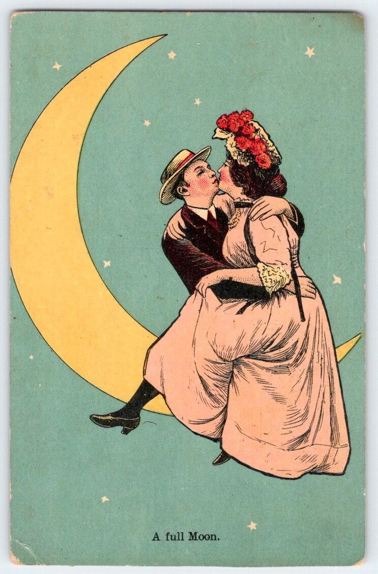 1908 A FULL MOON ROMANTIC KISING COUPLE ON CRESCENT MOON POSTCARD