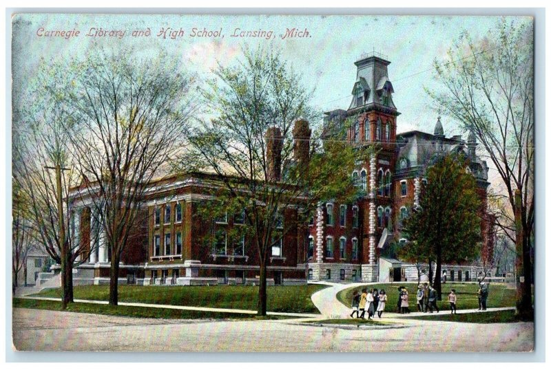 1908 Carnegie Library High School Building Students Lansing Michigan MI Postcard