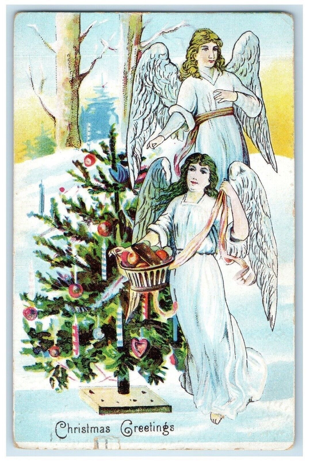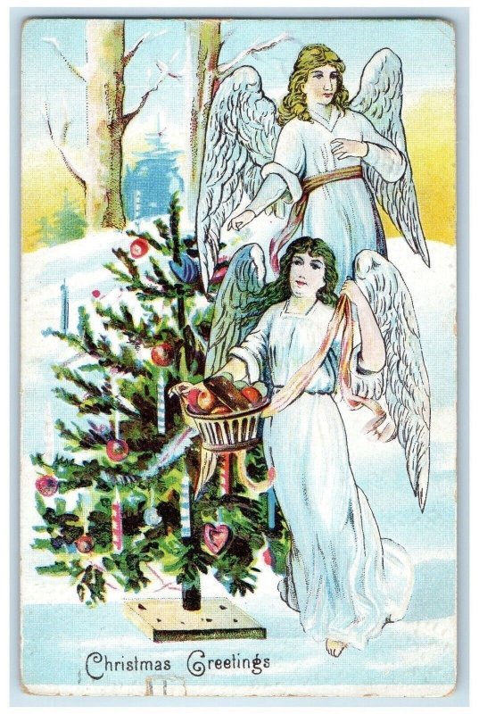 1908 Christmas Greetings Angels Decorating Christmas Tree Chicago IL Postcard