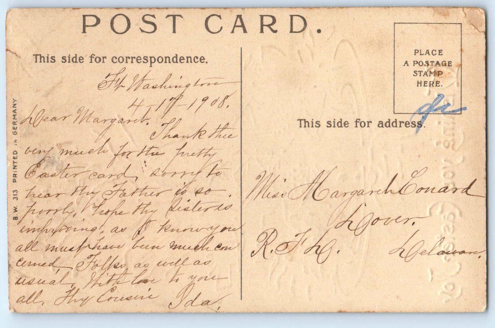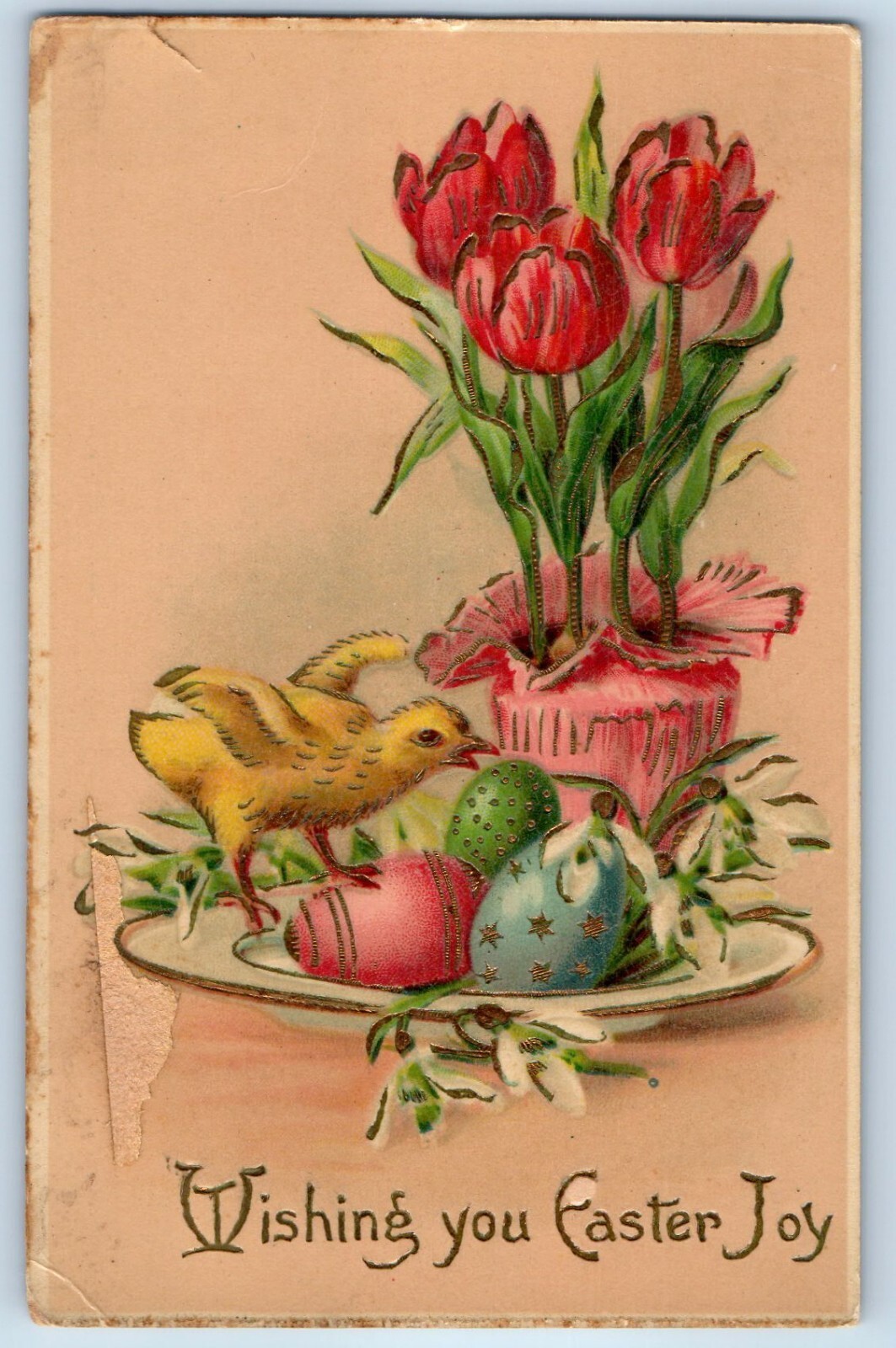 1908 Easter Chick Birds Red Tulip Flowers Eggs Embossed Dover Delaware Postcard