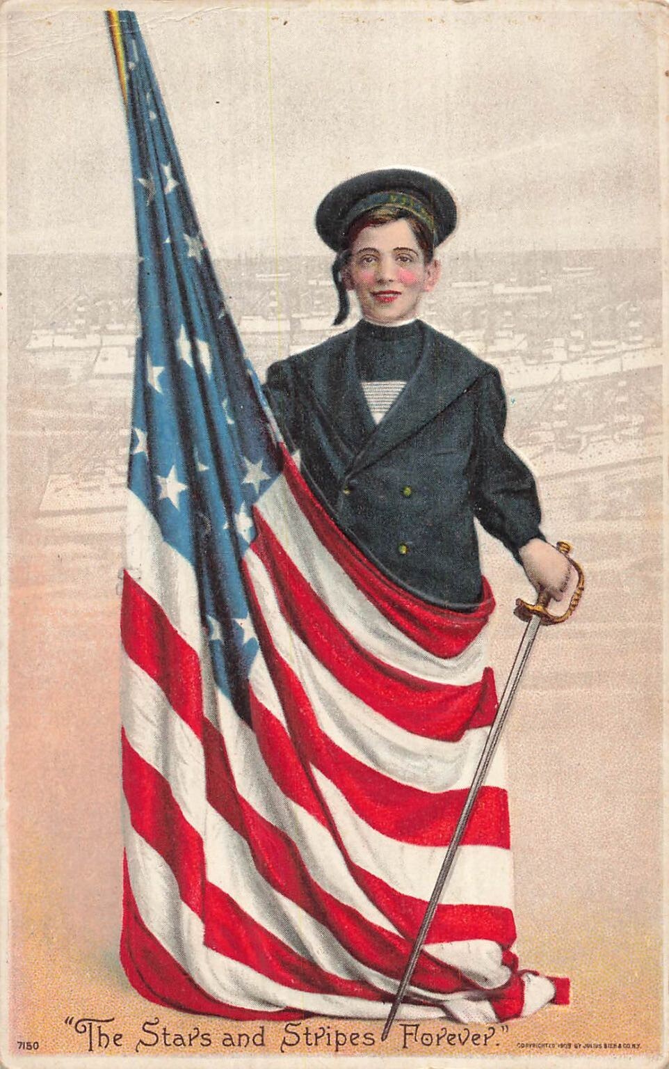 This magnificent early 20th-century postcard, copyrighted 1908 by Julius Bien & Co. N.Y., captures a powerful patriotic sentiment. It features a young boy, possibly a cadet or sailor, proudly holding a large American flag that drapes around him, accompanied by a ceremonial sword. The intricate embossing gives the flag and the boy a tactile, three-dimensional quality, enhancing the visual appeal of this Americana collectible. A faint cityscape forms the backdrop, hinting at a bustling port or urban setting.The reverse side reveals a vibrant piece of history, postmarked from Chicago, Illinois, on March 2, 1911, and bears a one-cent George Washington U.S. postage stamp. It was addressed to Mrs. Helen Bigwood in Cochituate, Massachusetts, with a personal message, "From Martha." The postcard's series number 7150, part of the "FLAG" series, and the distinct Julius Bien & Co. publisher's logo are clearly visible, marking it as a product of a well-known early 20th-century postcard manufacturer. This piece is a wonderful addition for collectors of patriotic memorabilia, American history, or vintage ephemera.