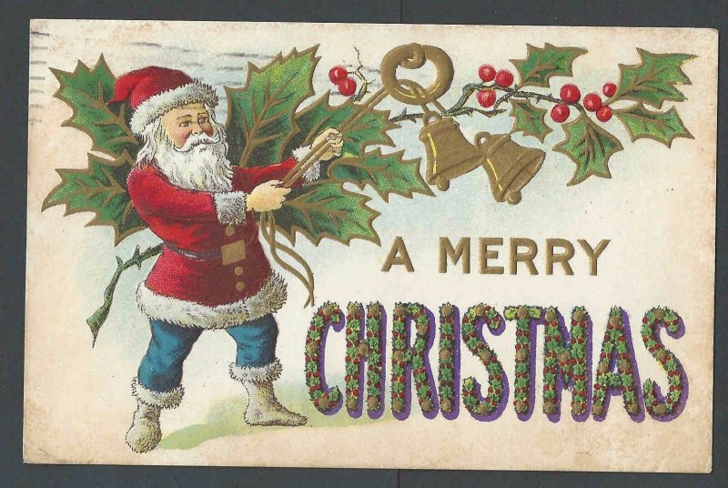 1908 PPC* Xmas Greetings W/Santa & Bells Embossed Posted