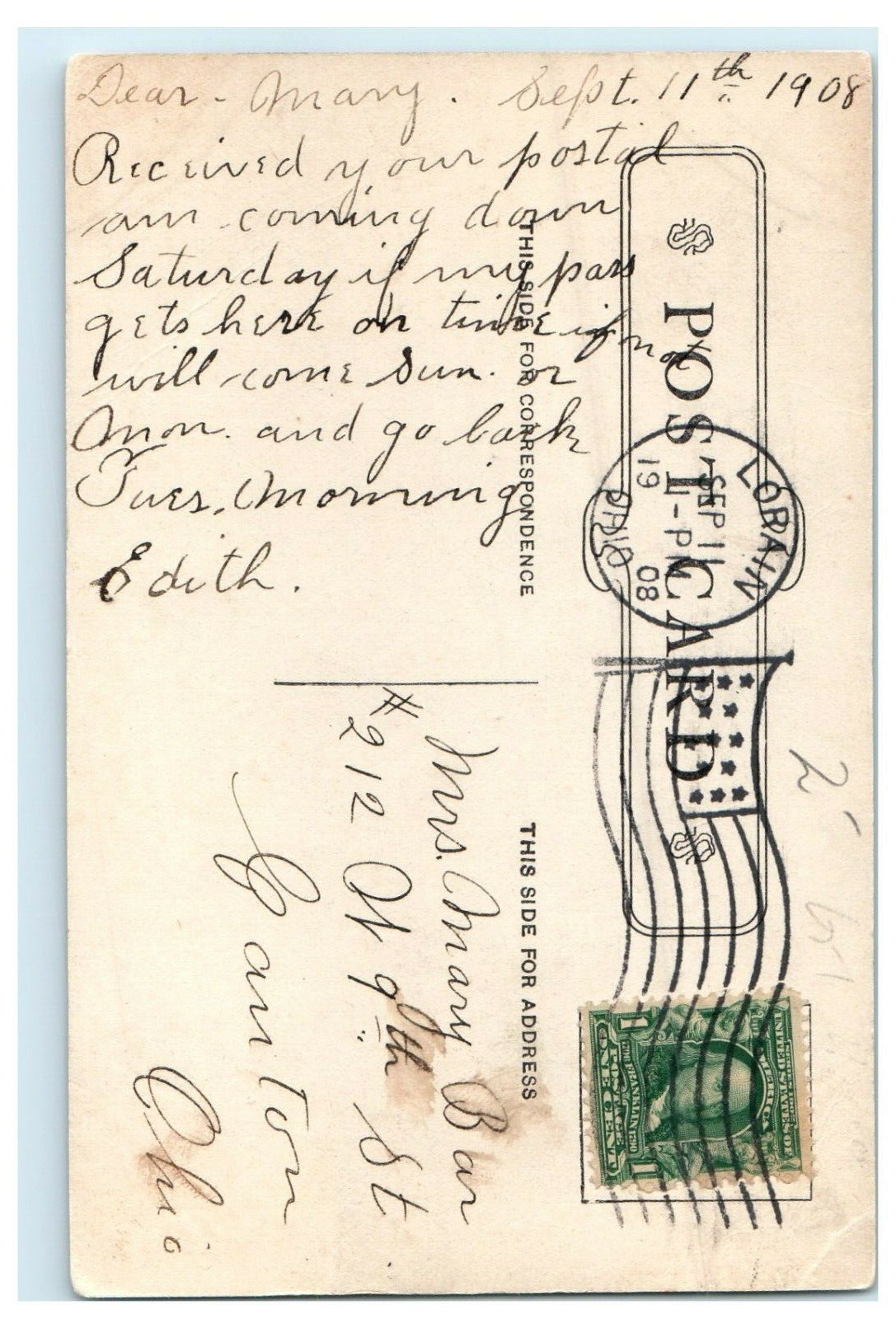 1908 The Carnegie Library Lorain Ohio OH Posted Antique Postcard