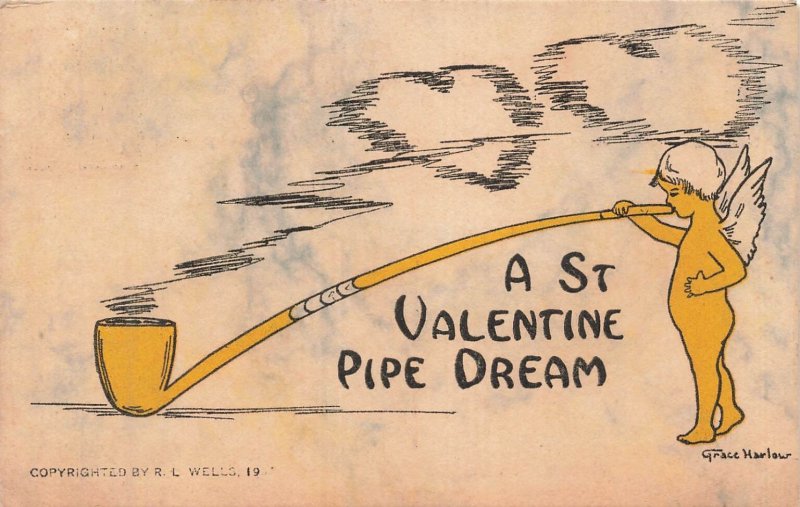 This charming vintage postcard from 1910 features a whimsical illustration titled "A St Valentine PIPE DREAM." The delightful design by Grace Harlow depicts a cherubic figure, often associated with Cupid, blowing into an exaggeratedly long yellow pipe. From the pipe's bowl, smoke gracefully ascends and curls into multiple heart shapes, symbolizing love and romantic aspirations. The artwork captures the innocent and romantic spirit of the Edwardian era, making it a wonderful piece of historical ephemera for collectors of holiday or fantasy-themed postcards.The reverse side reveals a clear "Post Card" divided back, characteristic of postcards from this period. It bears a crisp February 10, 1910, postmark from Bristol, Virginia, along with a one-cent U.S. postage stamp. The postcard was addressed to Miss Sue Mae Lincoln in Columbia, Tennessee, and includes a handwritten message conveying sweet sentiments, adding a personal touch and a glimpse into past correspondence. This collectible item is a beautiful representation of early 20th-century Valentine's Day greetings and offers a tangible connection to history.