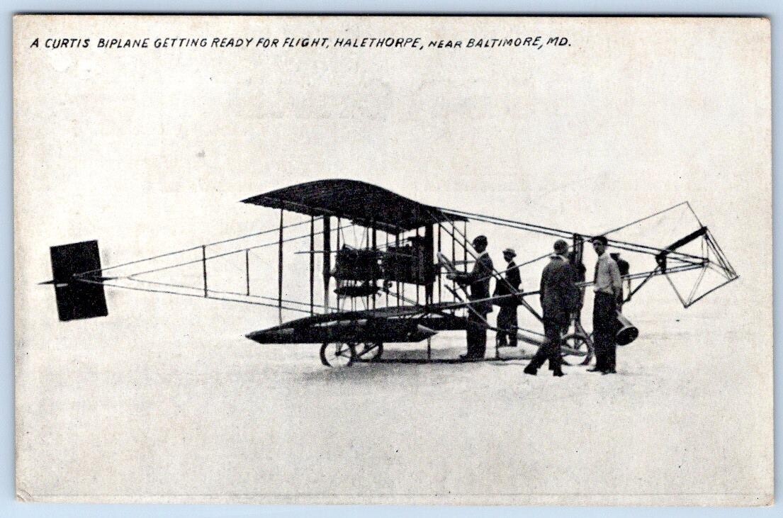 1910's CURTIS BIPLANE GETTING READY FOR FLIGHT HALETHORPE BALTIMORE MD POSTCARD