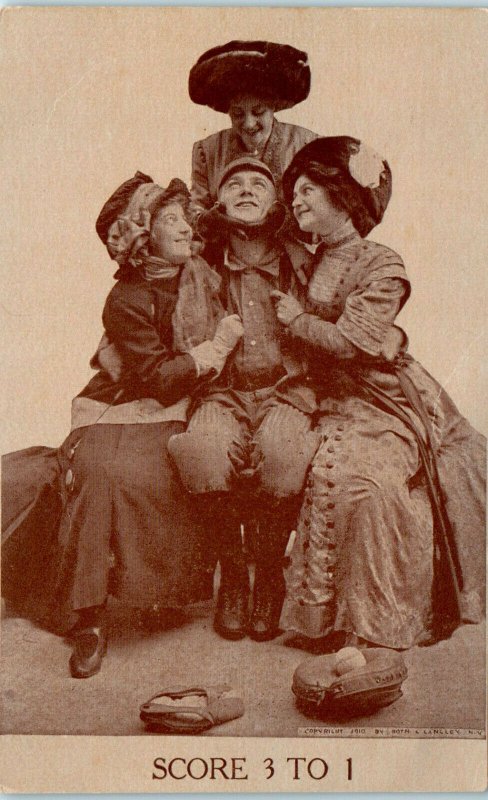 1910s "Score Three to One" Baseball Player with Three Ladies Postcard