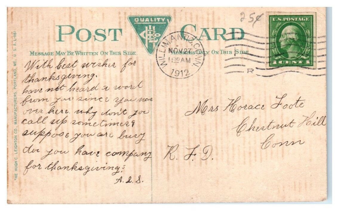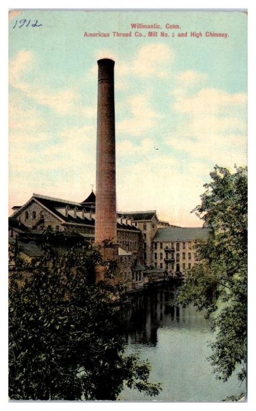 I have for sale one 1912 American Thread Co. Mill No. 2 and High Chimney, Willimantic, CT Postcard.