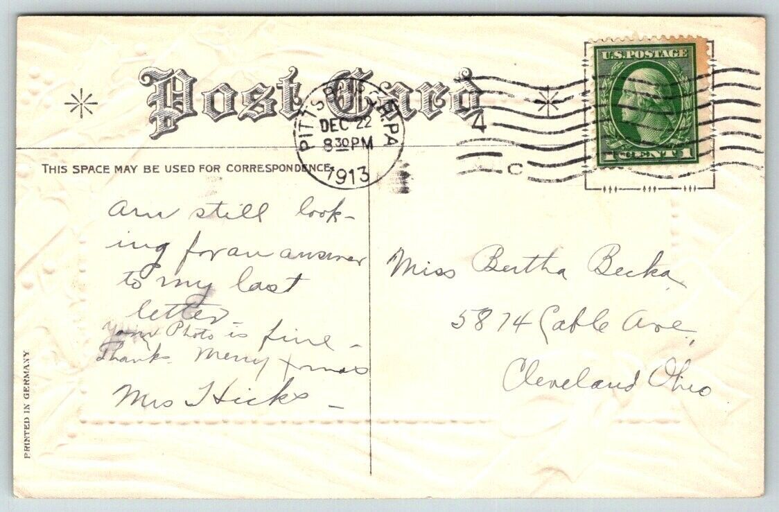 1913 Christmas Greetings Xmas Embossed Postcard