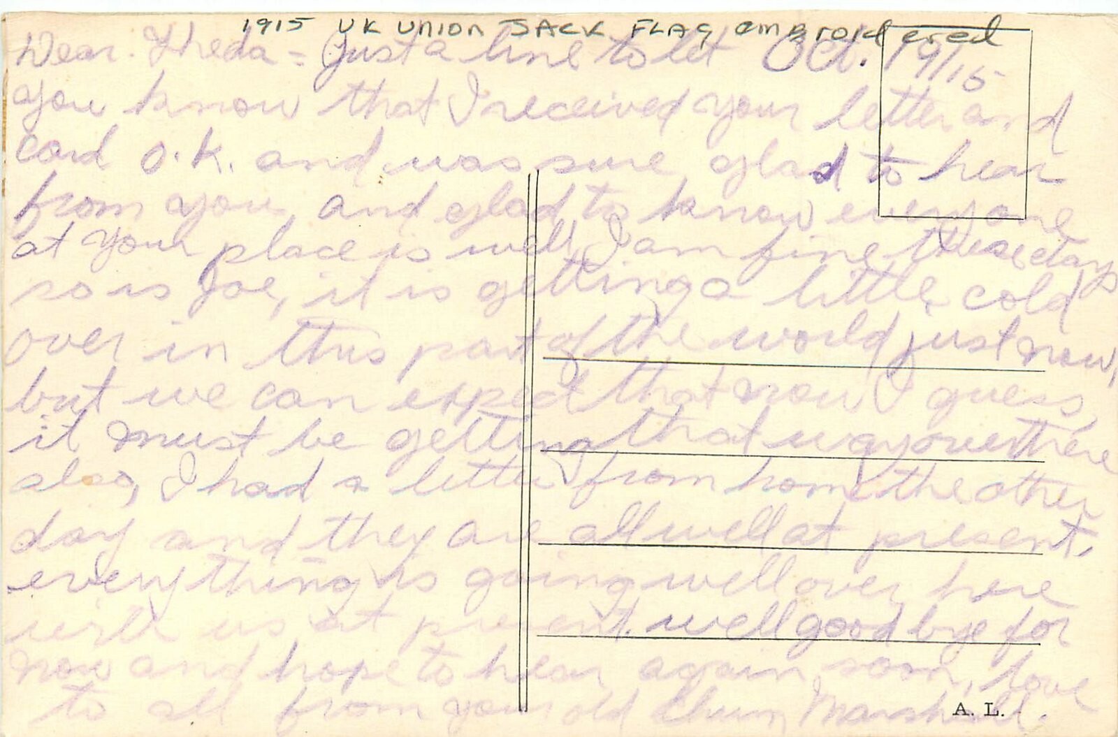 1915 UK Union Jack flag embordered Postcard 25-2515