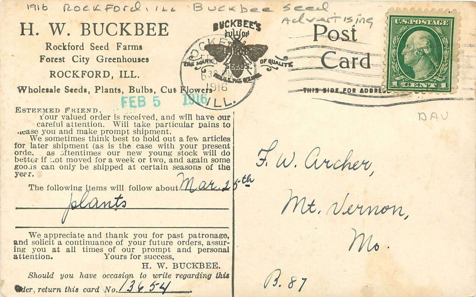 1916 Rockford Illinois Buckbee Seed Advertising Woman Postcard 25-10915