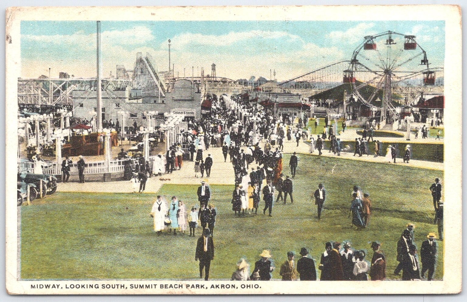 Step back in time to the vibrant summer of 1920 with this captivating vintage postcard featuring the bustling Midway at Summit Beach Park in Akron, Ohio. The scene, captured looking south, teems with activity, showcasing an impressive Ferris wheel, a thrilling roller coaster, and a multitude of park-goers enjoying a day of leisure and excitement. Details like a prominent "Cigar Stand" add to the authentic historical charm of this bygone amusement park.This early 20th-century postcard offers a fascinating glimpse into American recreational culture and the grandeur of early amusement parks. It was published by The Rubber City Distributing Company, Inc., based in Akron, Ohio, and manufactured in the U.S.A., reflecting its local significance. The vivid colors and detailed depiction make it a unique piece for collectors of Ohioana, amusement park history, or vintage postcards, preserving a moment from a lively era.
