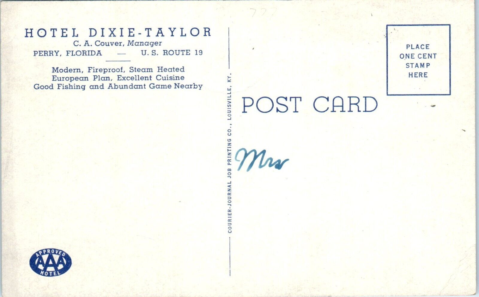 1920s Hotel Dixie-Taylor U.S. Route 19 Perry Florida Postcard