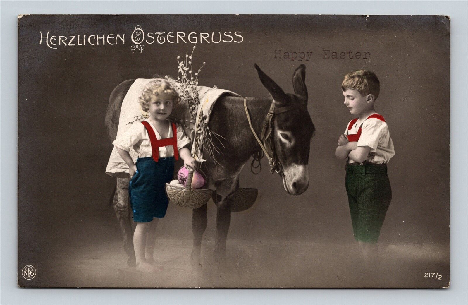 1920's RPPC Children Donkey Basket Eggs Hearty Easter Greetings Postcard
