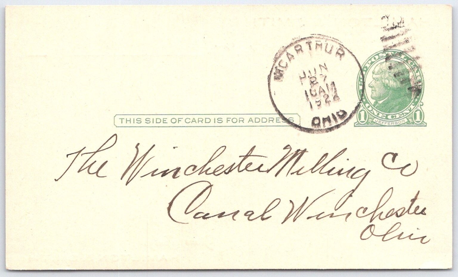 This original paper postcard from 1922 features a handwritten order from Hamilton & Smith, successors to H.S. Hamilton, based in McArthur, Ohio. The card measures a standard 5.5 x 3.5 inches, typical of early 20th-century postcards. The green one-cent stamp depicting Thomas Jefferson is postmarked from McArthur, Ohio, offering a glimpse into postal history and commerce of the era. The card is addressed to The Winchester Milling Co. in Canal Winchester, Ohio, illustrating a business transaction involving agricultural goods such as wheat and white meal.The postcard is a valuable collectible for those interested in early American industrial and agricultural history, Ohio local history, or vintage postal ephemera. The handwritten note adds a personal and authentic touch, while the clear postmark date of June 27, 1922, helps pinpoint its historical context. This piece is a great example of business communication before the digital age and offers insight into the milling industry in Ohio during the early 1900s.