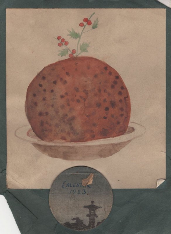 CHAU1962 Antique 1923 Calendar which looks as though the owner has hand painted (what seems) a Christmas pudding ? all hand created and have affixed a fold open calendar at the bottom which is professionally printed from the era as its fold open - the whole thing is sized 7" x 5" - Whilst mostly good condition has faults to lower left corner so graded fair to good - very unique.