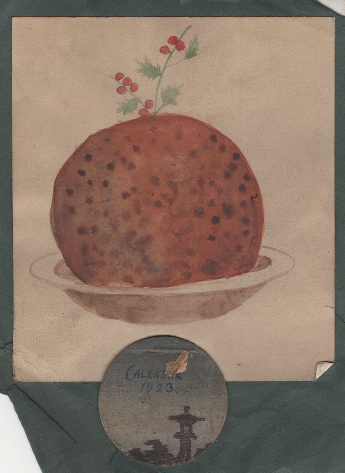 CHAU1962 Antique 1923 Calendar which looks as though the owner has hand painted (what seems) a Christmas pudding ? all hand created and have affixed a fold open calendar at the bottom which is professionally printe ... Read More