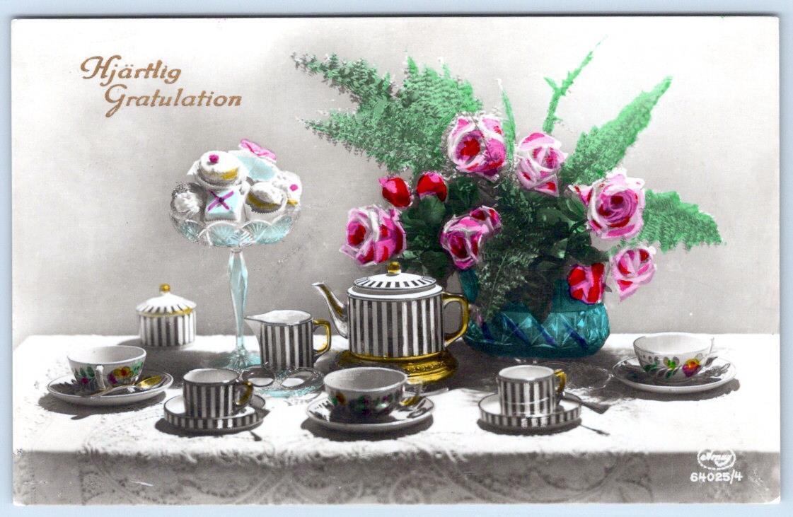 1932 RPPC HANDCOLORED CHINA DINNERWARE CRYSTAL CANDY DISH SWEDISH POSTCARD