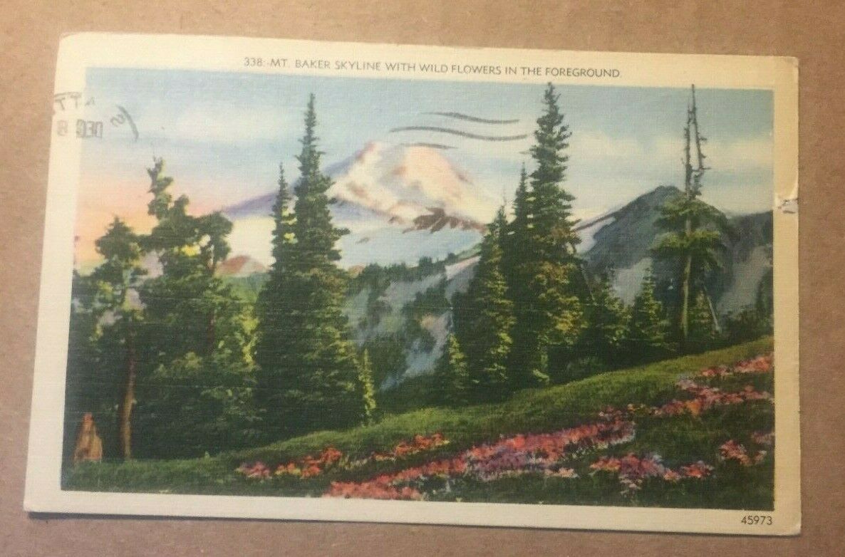 Vintage penny postcard - 194? Used - mt. Baker skyline with wildflowers in the foreground, washington. Please check the photo for the actual postcard you will receive.Thanks for looking.***please be aware the Hip standard shipping will be shipped in a plain white envelope with no protection except a soft postcard sleeve with an index card on each side ( item could get damaged in shipping) and no tracking available**