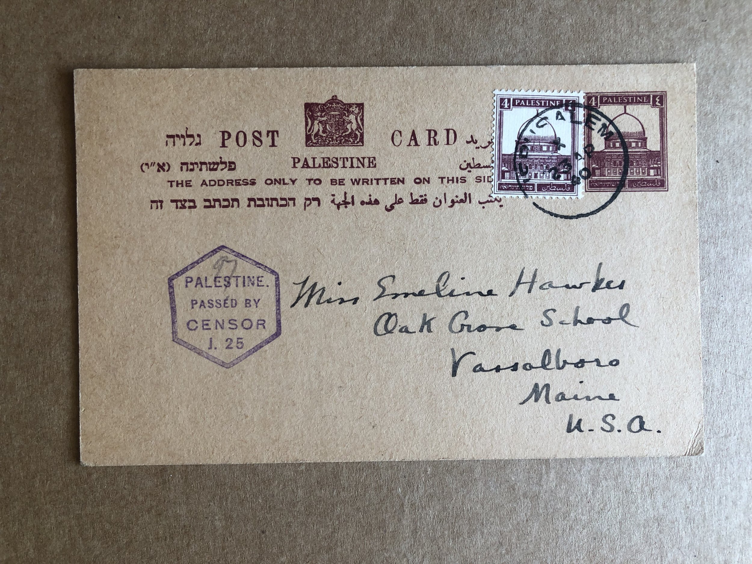 1940 Postcard from Palestine, passed censor