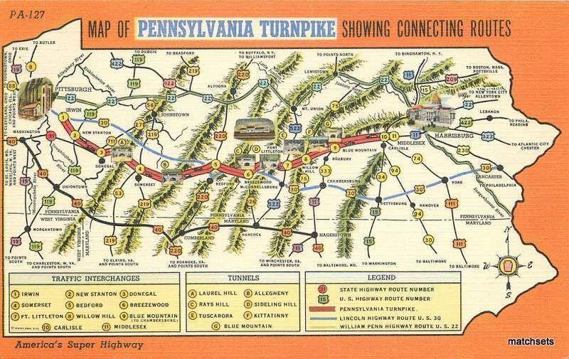 Vintage divided linen postcard of Map attractions PA Turnpike. Published by Curt Teich & CO.
