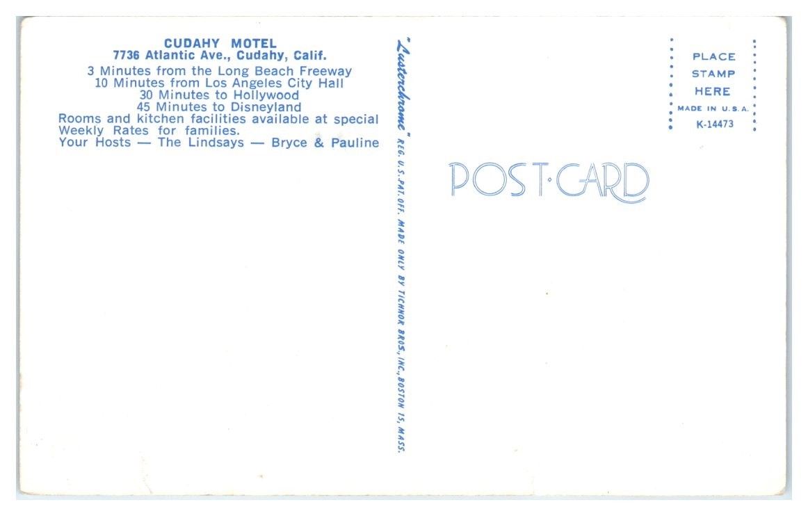 1950s/60s Cudahy Motel, Cudahy, CA Postcard