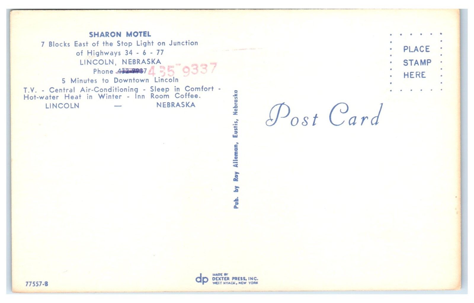 I have for sale one 1950s Sharon Motel, Lincoln, NE Postcard.