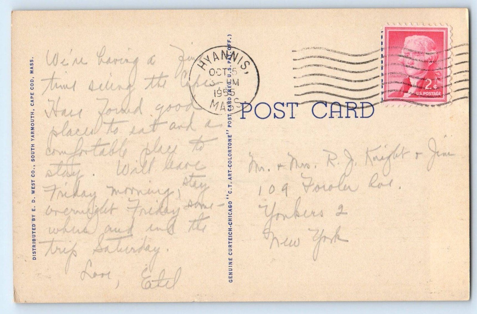 1955 Cape Cod Massachusetts Postcard Main St. Looking West Hyannis Shop Building