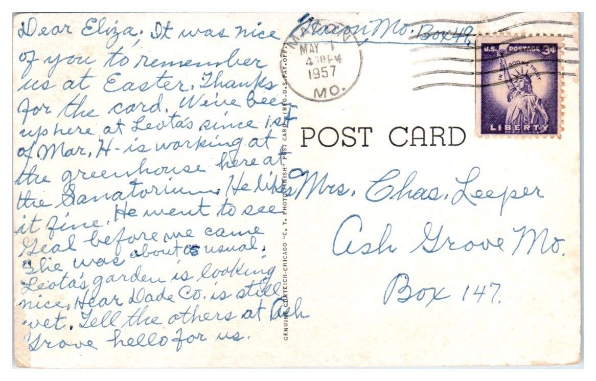 I have for sale one 1957 Samaritan Hospital, Macon, MO Postcard.
