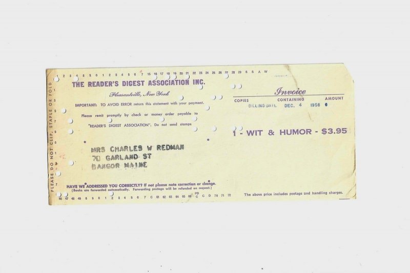 1958 Vintage Reader's Digest Receipt for Payment Ephemera Receipt for The Treasury of Wit and Humor. In good Vintage condition with some wear from use and storage DWA12