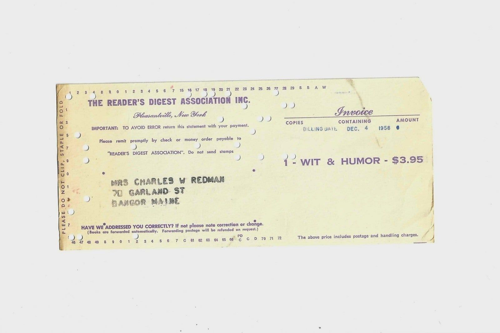 1958 Vintage Reader's Digest Receipt for Payment Ephemera