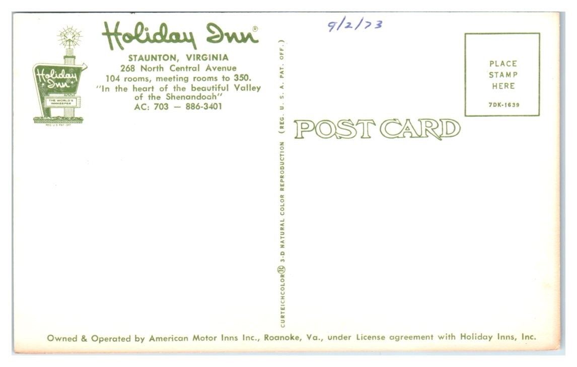 I have for sale one 1970s Holiday Inn, Staunton, VA Postcard.