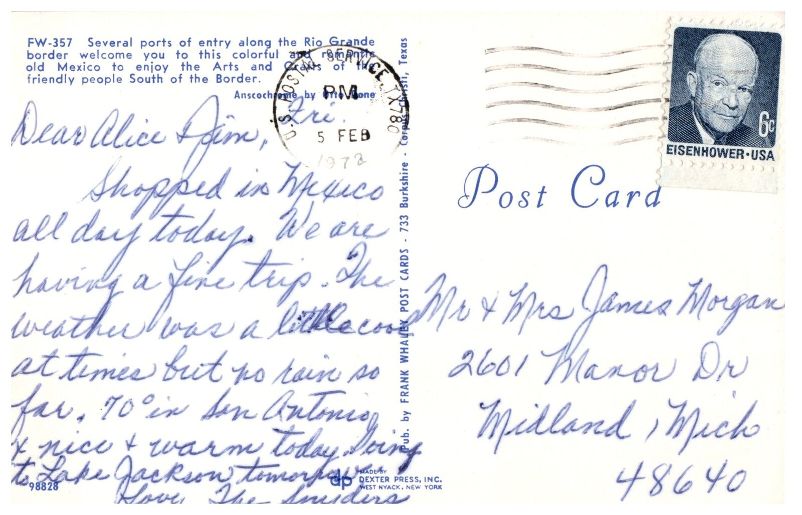 This vintage postcard features a vibrant scene of Mexican artisans crafting traditional ceramic pieces, captured with rich colors. The 1973 card includes a postmark and features an Eisenhower stamp. Produced by Dexter Press, this postcard offers a glimpse into the arts along the Rio Grande. Used with writing and postmarked. Condition: May have wear typical of old postcards such as worn edges, stains, writing, creases, ink marks, or minor tears. Please review all photos. Check our store for more postcards and other vintage items! Combined shipping available for most items.