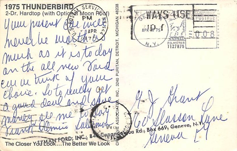 1975 Thunderbird Postcard 1975, Grade: 3, , Size: Regular size: Approx 3 1/2 X 5 1/2 inch (9 cm X 14 cm) Grading Scale: Grade 1 = Perfect corners Grade 2 = Very Minimal corner wear, no creases Grade 3 = Some c ... Read More