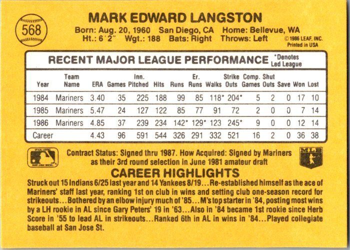 1987 Donruss Baseball Mark Langston Seattle Mariners sk20297