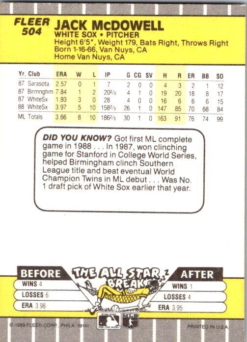 1989 Fleer Baseball Card Jack McDowell Chicago White Sox sk2773