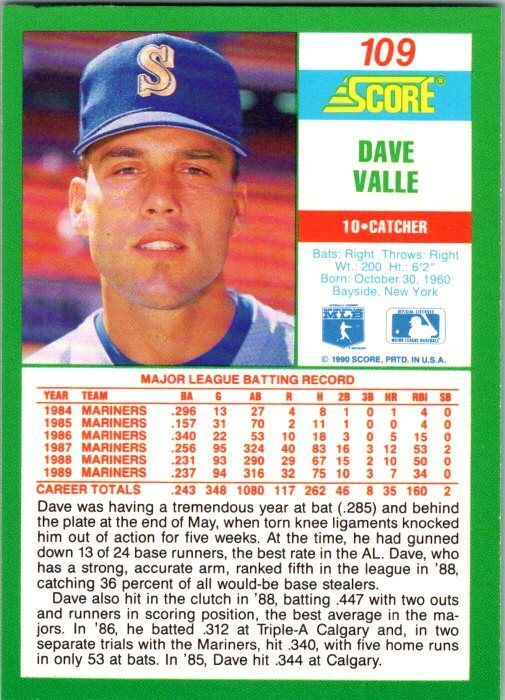1990 Score Baseball Card Dave Valle Seattle Mariners sk2660